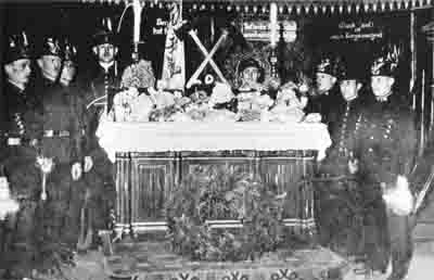 Knappen in ihren Trachten umstanden den mit kostbaren Erzen geschmückten Altar in der Müsener Kirche beim Abschied von ihrem Bergbau |