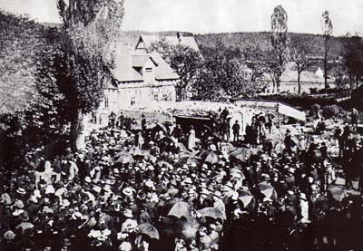 Die Glocken wurden Sturm geläutet und grelle Trompetensignale erschallten durch den Ort. Die Männer eilten von Hütten, Gruben und den Feldern herbei um zu helfen. Das Feuer aber war schneller und ehe man sich versah, stand ein dutzend Häuser lichterloh in Flammen. Die Feuerwehr war schnell zur Stelle aber machtlos gegen diese gewaltige Feuerwelle. Sie hatte zwar eine Spritze, die aber erst mit Wasser aus Eimern gefüllt werden musste und dann von vier Mann bedient werden musste. Es gab noch keine Wasserleitung, an der man Schläuche anschließen konnte. Auch gab es noch keine Motorspritzen, keine Löschfahrzeuge oder chemische Mittel zur