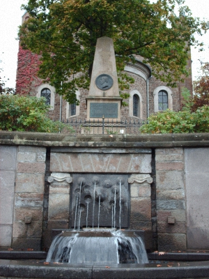 Das von Friedrich Reusch entworfene Jung-Stilling-Denkmal in Hilchenbach vor der ev. Kirche mit dem Brunnen der Stadt (Bild: Stefan Flöper)