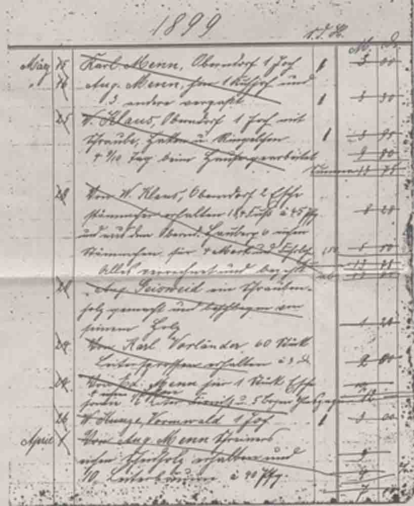 Tagebuch von August Menn mit der ersten Eintragung vom 15. März 1899 über das erste verkaufte Joch. Er erhielt dafür 3 Mark. Bezahlte Positionen wurden durchgestrichen.