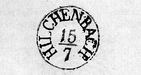 Der erste Hilchenbacher Poststempel. Der so genannte Fingerhutstempel mit einem Durchmesser von 18 mm wurde vermutlich etwa 20 Jahre benutzt. Es gab ihn in 2 Ausführungen: mit und ohne Trennstrich. Eine Jahreszahl wurde noch nicht gestempelt. Deshalb ist eine genaue Datierung heute schwierig