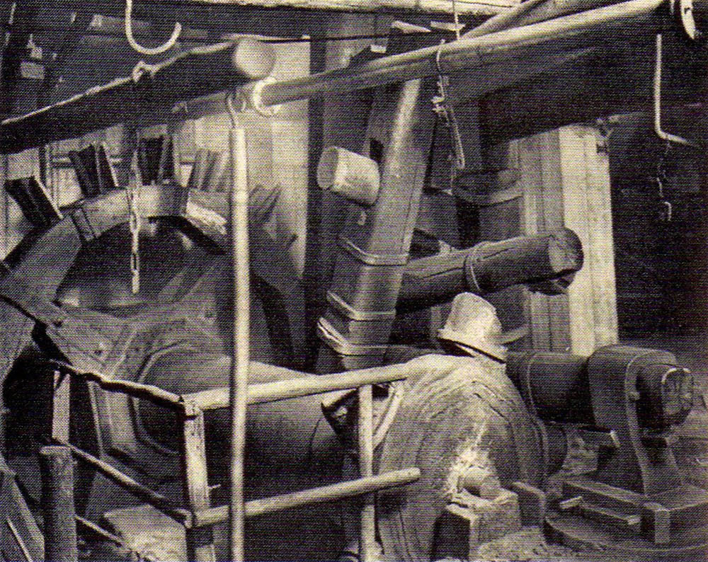 Tierfellen bespannt war, angetrieben. Man hatte nun zur Verhüttung genug Wind und führte ihn zum Blasofen. Als später der Wind erhitzt wurde, konnte man eine höhere Temperatur noch schneller erreichen.